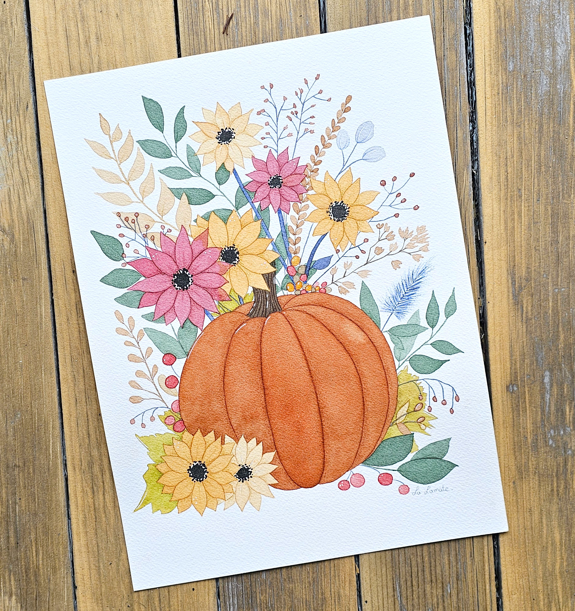 Plongez dans l’esprit chaleureux de l’automne avec cette illustration originale peinte à l’aquarelle. Un délicat mélange de citrouilles et de fleurs d’automne dans des tons orangés qui capturent toute la beauté et la convivialité de cette saison magique. Ce format A4, parfait pour décorer votre intérieur, apportera une touche de couleur et de nature à votre espace. Idéale pour les amoureux de l’automne, cette œuvre saura sublimer votre décor avec une touche authentique et chaleureuse. Ajoutez un peu de charme automnal à votre maison !